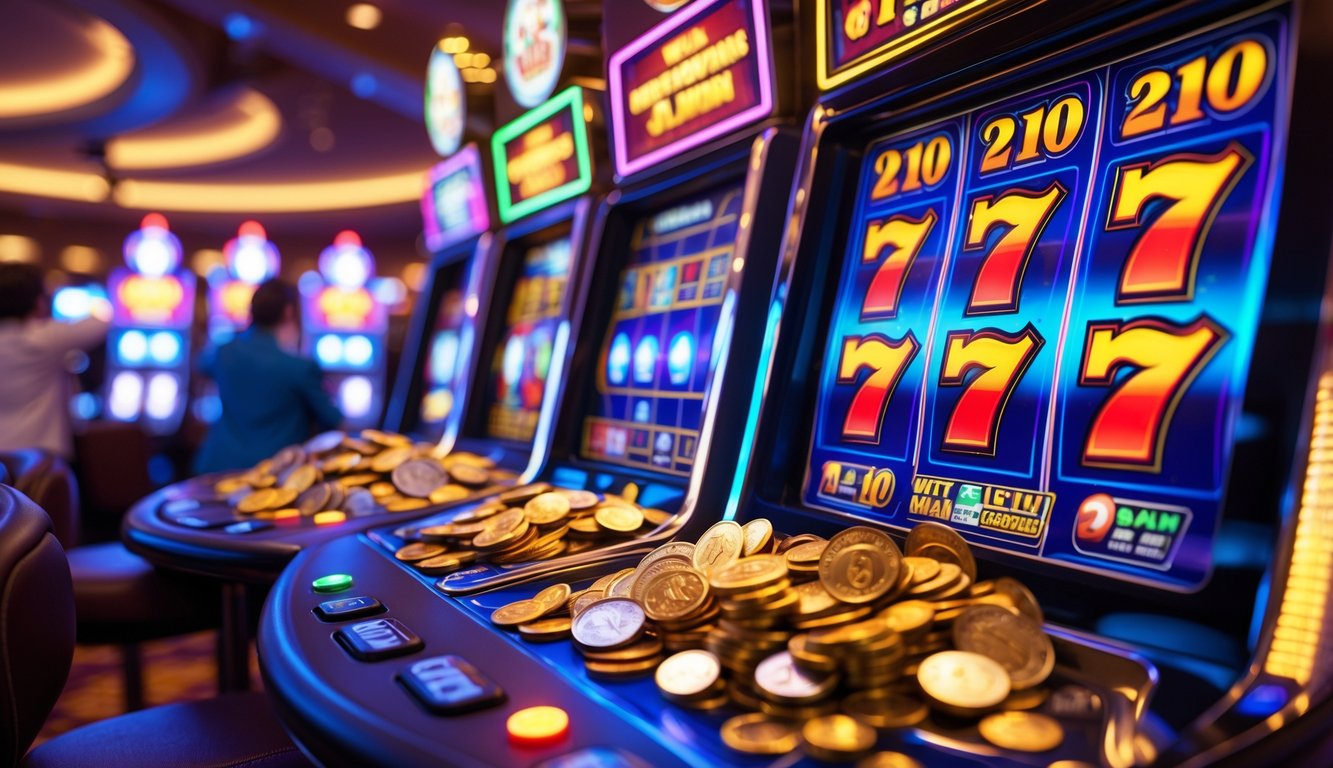 Mesin slot dengan lampu warna-warni dan koin melimpah menunjukkan kemenangan jackpot besar di dalam kasino yang ramai.